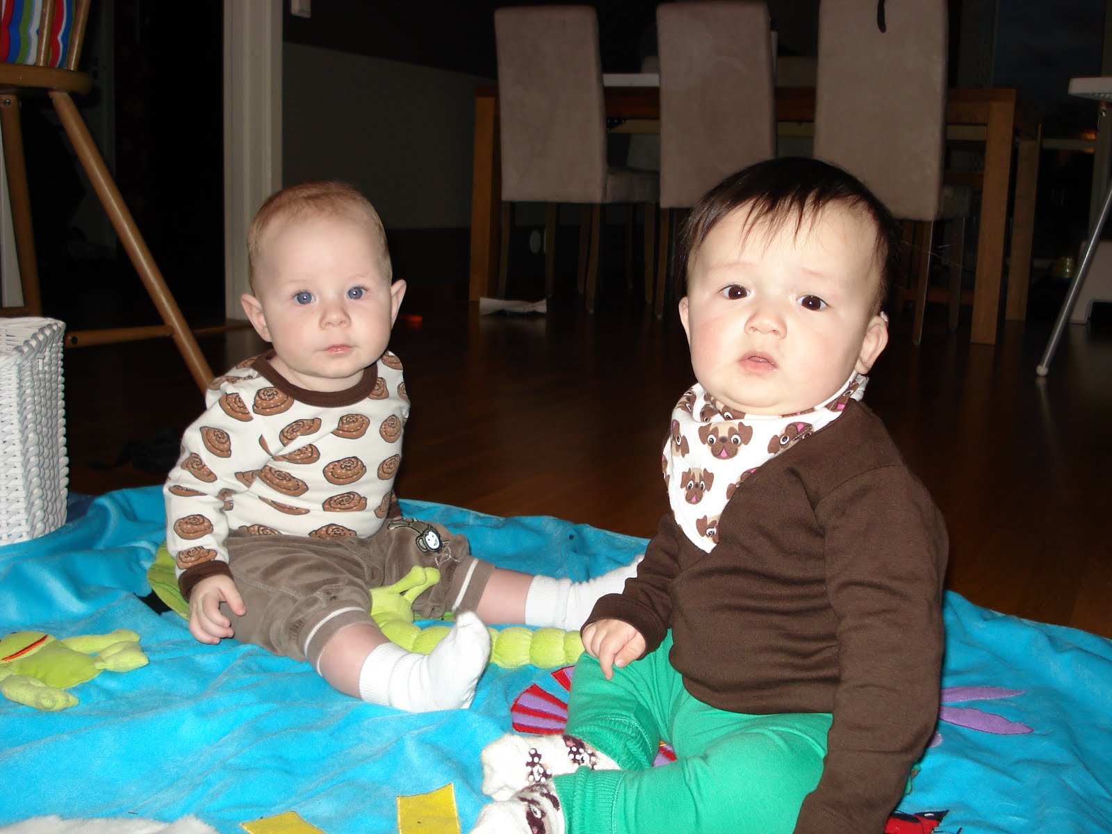 Nu på kvällen visade det sig att även Lukas fått feber – inte undra på att han varit gnällig hela eftermiddagen, jag trodde det bara var jag som var trött och inte orkade med… Får se om det blir lite bättre med alvedon. Han har dessutom tand nr 2 på gång, så det gör väl inte saken bättre heller. På tal om Lukas måste jag bara slänga upp en bild på honom och polarn – Isac – när de är jättesöta och sitter och ”leker”.