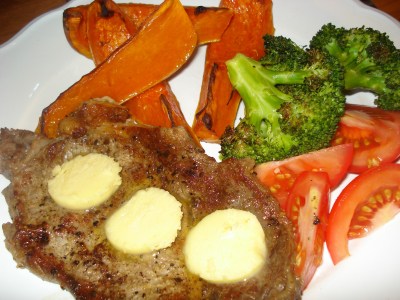 | Eftersom vi tyckte lite synd om oss själva fick det bli lite lyxig snabbmat till lunch – en bit entrecôte och ugnsbakad butternut-pumpa, Mmmmmm….. |
