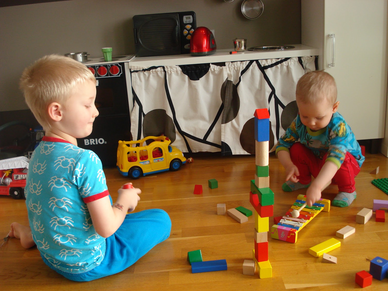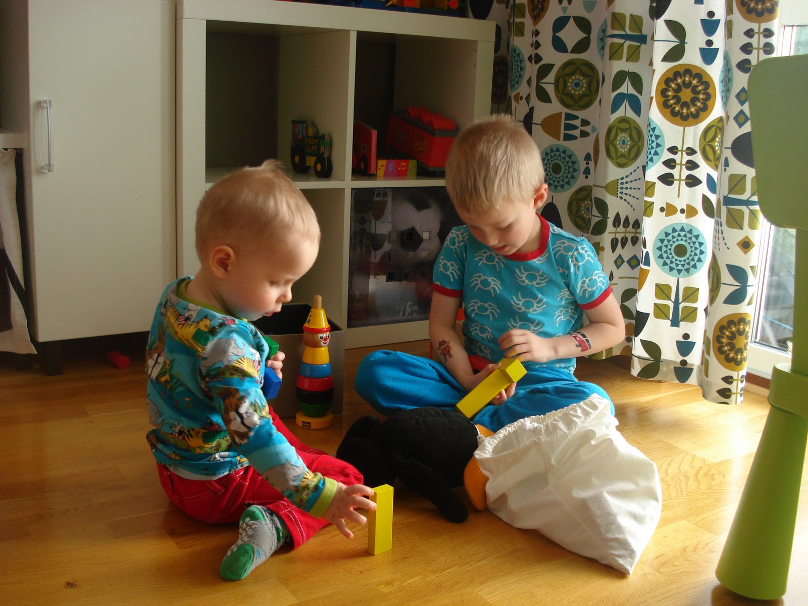 | Det är inte många tillfällen, men ibland händer det att båda pojkarna kan samsas och leka ihop. Bygga klossar är en höjdare på olika nivåer =) |