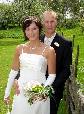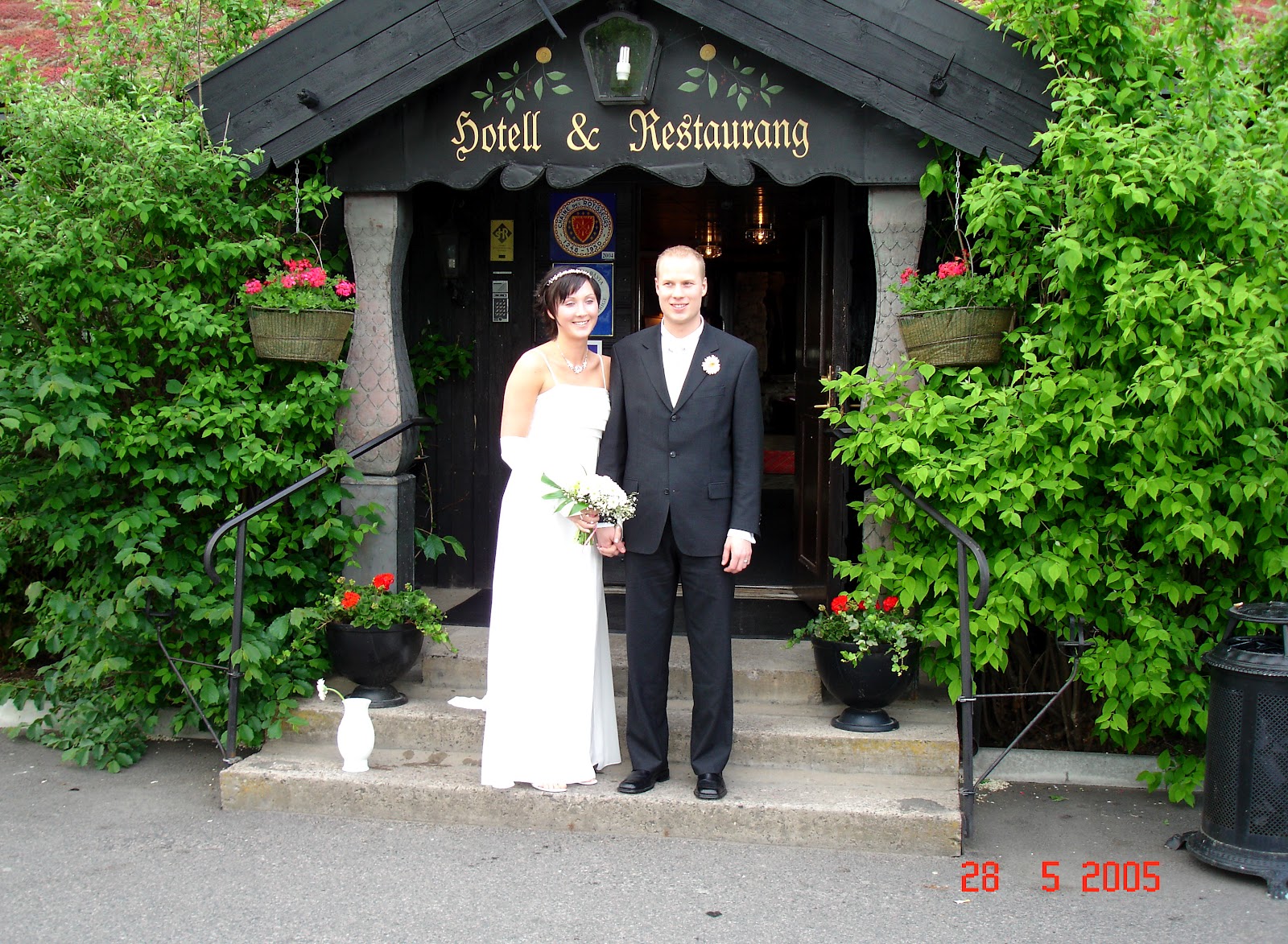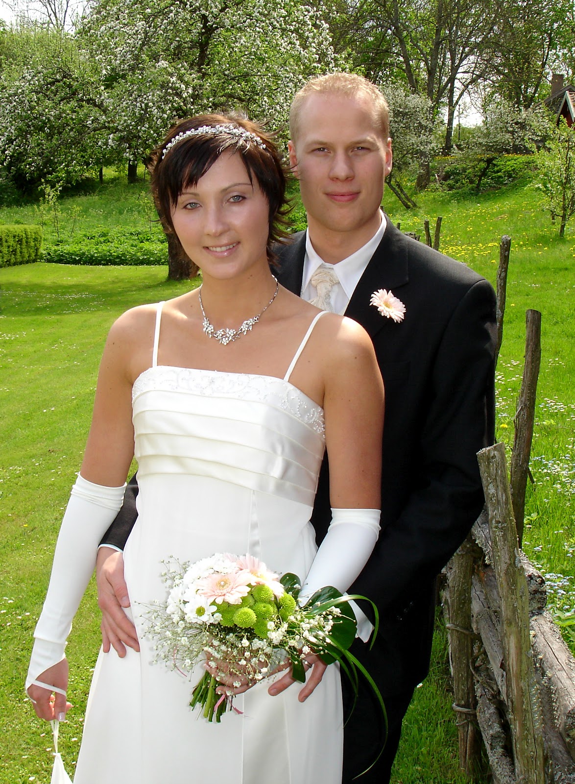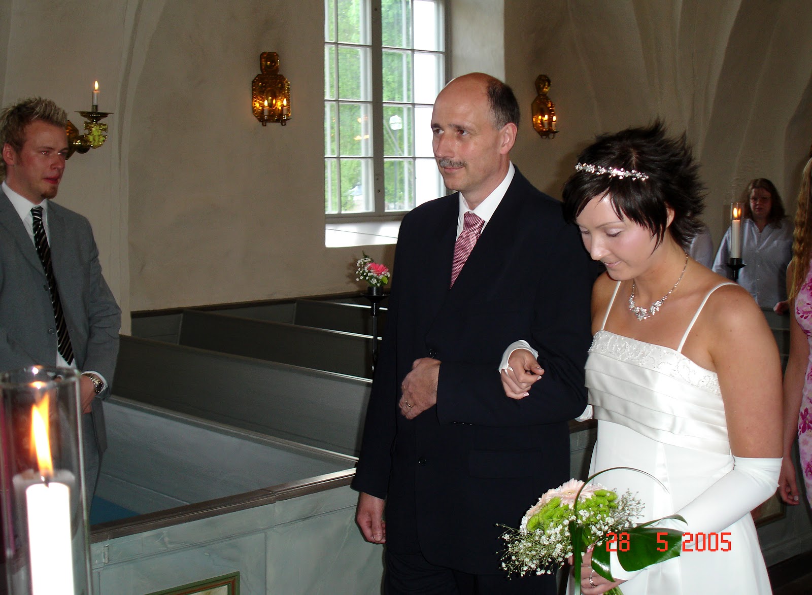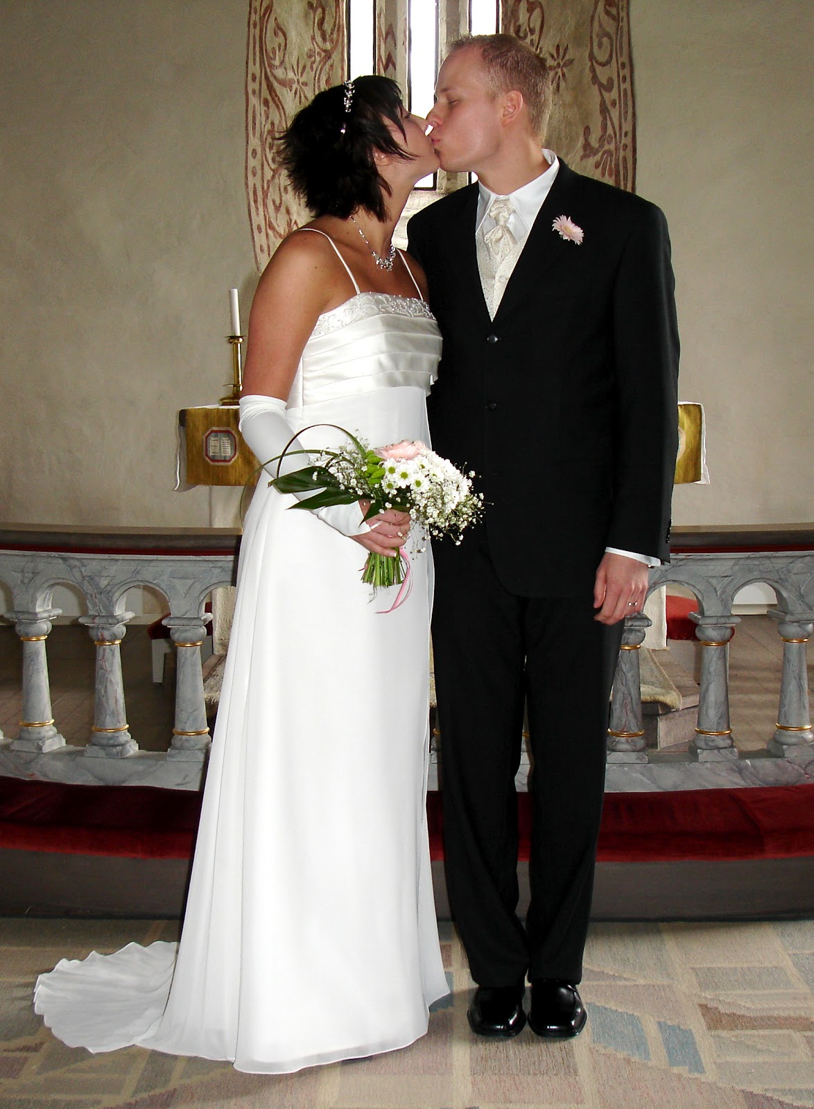 Lite kort kan man väl säga att vi hade ett ganska enkelt bröllop, ingen av oss hade nån vidare ekonomi, vi hade ju ganska nyligen slutat plugga. Vi bestämde oss för att bara ta med familjerna och så vänner, så inga släktingar utöver de allra närmsta, vi umgås ändå inte annars så varför dela en sådan viktig dag med dem då? Om jag inte minns fel så var vi ca 25 pers, med oss själva, och vi gifte oss i Ölmstads kyrka. Att det blev just den var för att den var liten, oerhört vacker, hade en ofantligt rolig och trevlig präst och dessutom var det nära till Gyllene Uttern (mer om det sen)