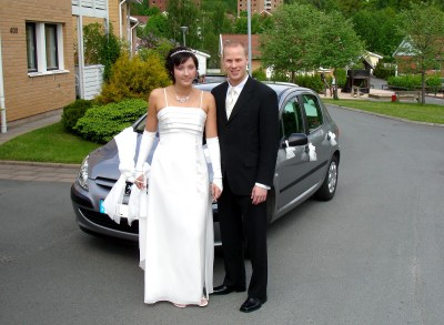 | Lite stela, lite nervösa – precis innan vi lämnar hemifrån mina föräldrar för att börja dagen med att fota… Mina föräldrar hade gjort vår bil jättefin med en stor fin spetsrosett på nosen =) |