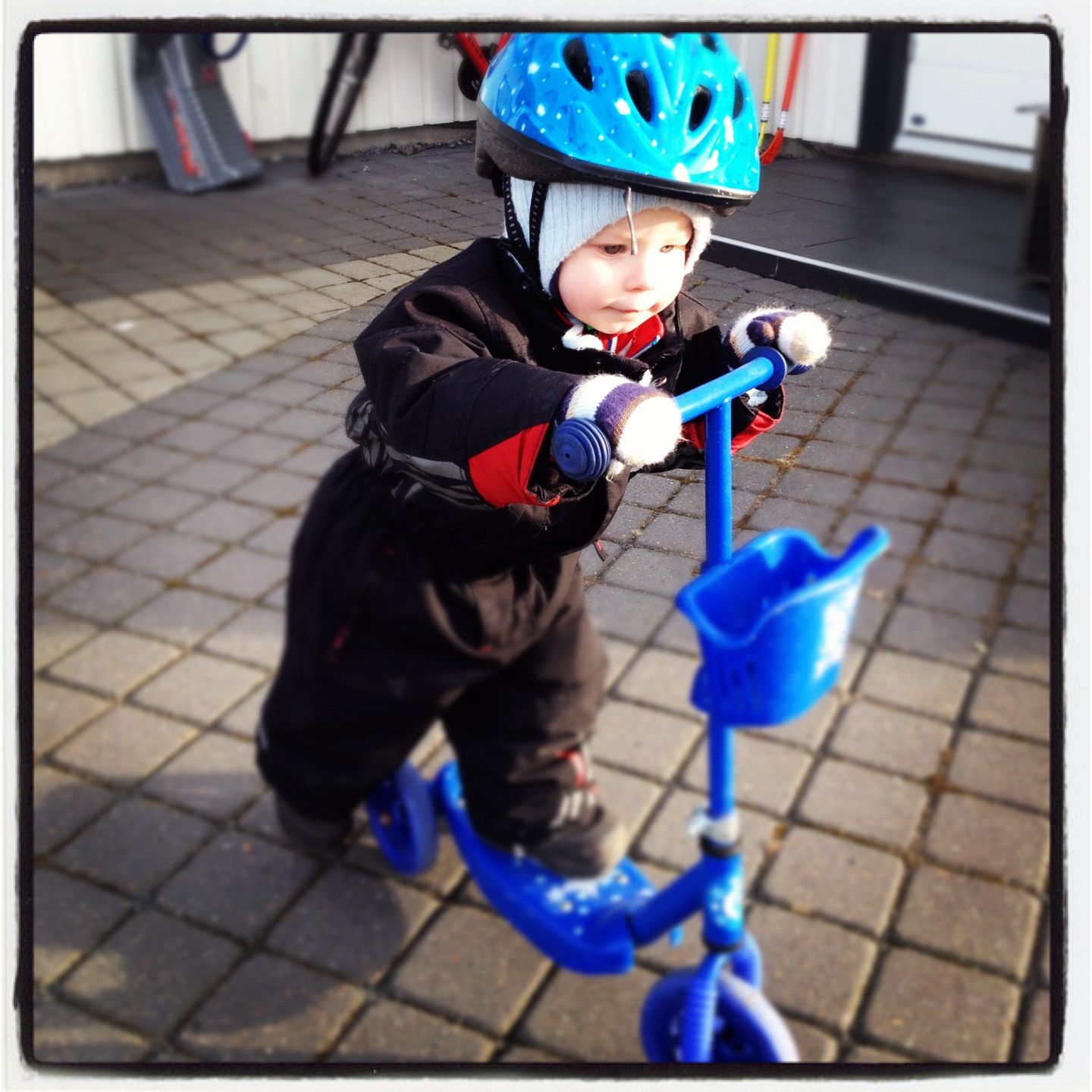 | En liten stund orkade han i alla fall vara med ute, och fick då prova brorsans gamla 3-hjuliga sparkcykel till stor förtjusning! |