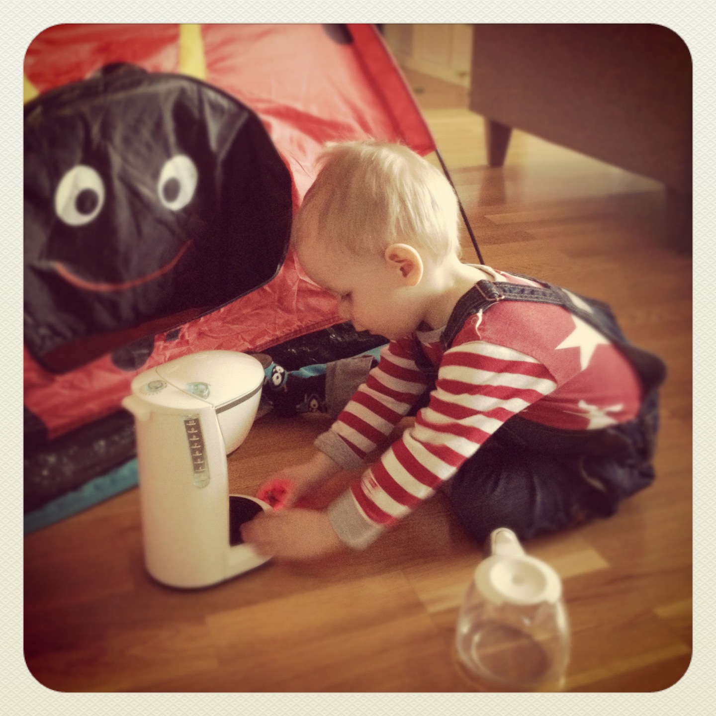 | Det pågår lite camping i vardagsrummet, och självklart måste ju varje förberedd campare ha en kaffekokare redo… |