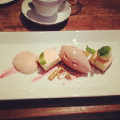 | Vaniljcheesecake med rabarbertrilogi samt vit chokladpralin fylld med lakrits |