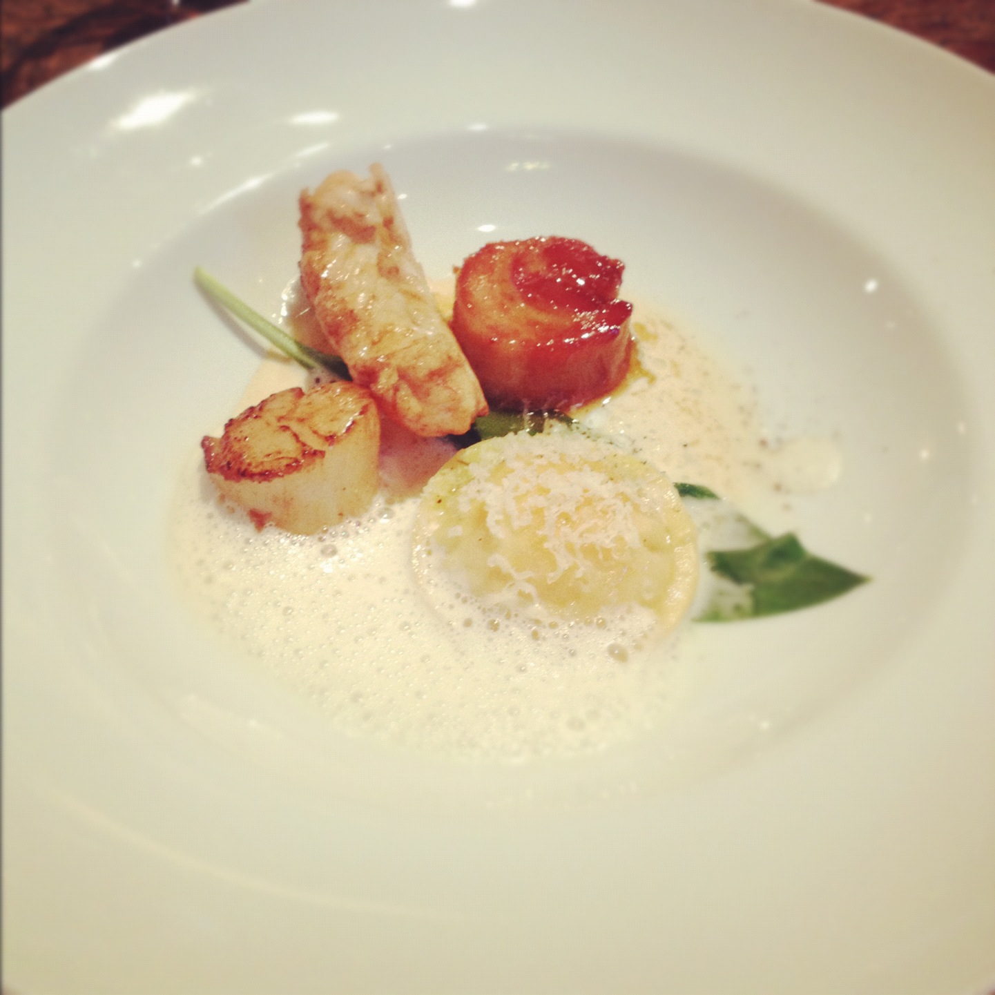 | Carbonara på mitt sätt: ravioli på lantägg med spädgrisbringa havskräfta och pilgrimsmussla serveras med vitvinssås smaksatt med Sivans 36 månaders Prästost samt svartpeppar och ramslök |