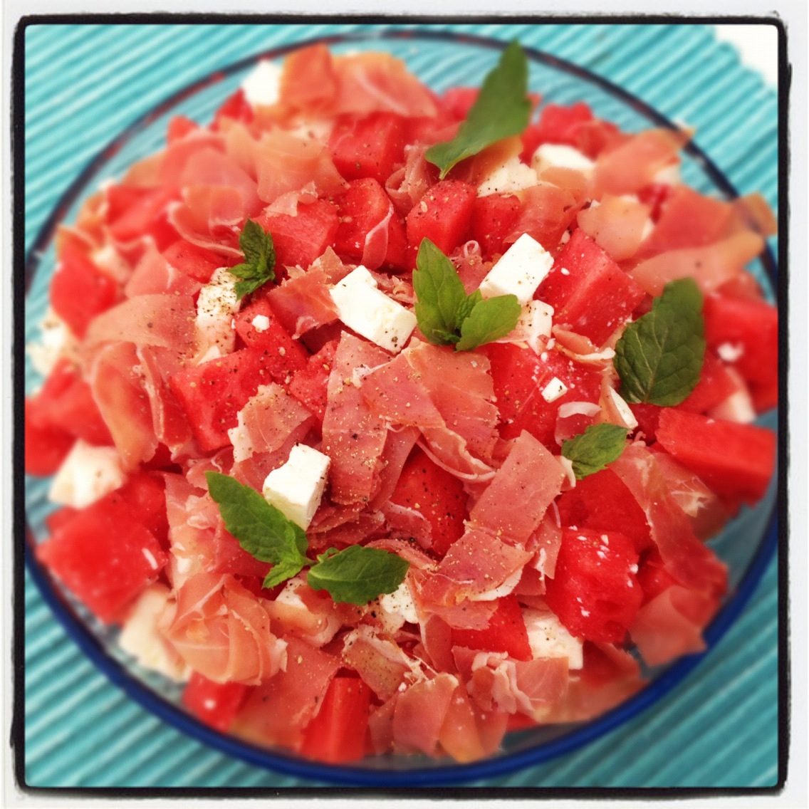 | Melonsallad: Helt enkelt vattenmelon, fetaost och ev. parmaskinka (gott utan det med). |