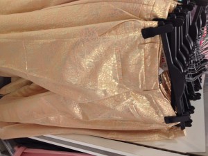 | Vad sägs om ett par mönstrade byxor i guld och aprikos? |