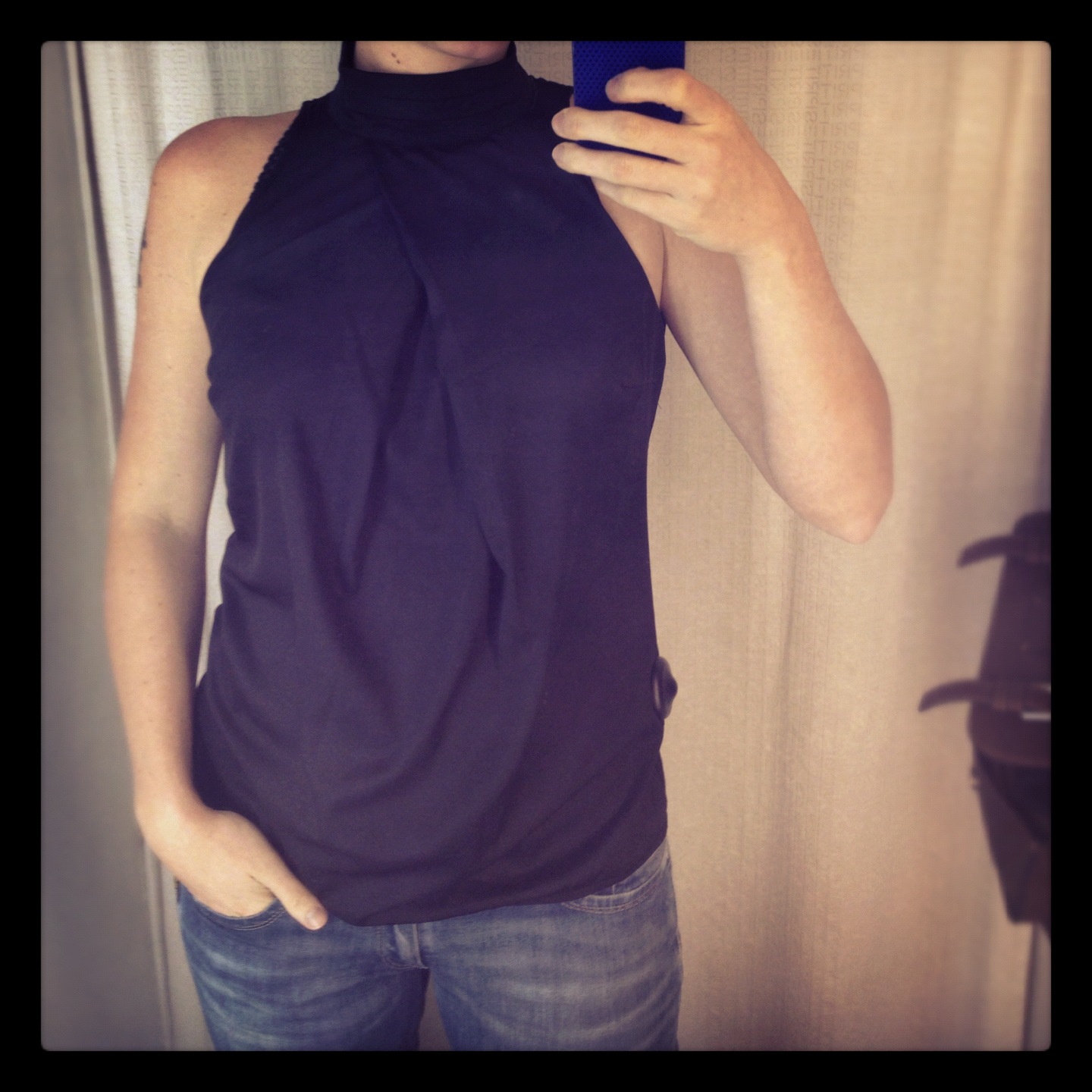 Har haft lite kläd-ångest gällande de kommande festligheterna, min festgarderob är minst sagt ganska tanig. En del klänningar är helt enkelt för stora (visserligen kul) och en del omoderna (jag går inte så ofta på fest tydligen), så det som blir kvar är en sorglig samling – två lite festligare klänningar i kort modell. Partytoppar har jag inga alls, den enda jag trodde jag hade kvar visade sig vara trasig, så idag fick det bli en tur upp till A6 för att försöka hitta nåt. Har letat tidigare, men jag kan verkligen inte ha modell rak och supervid, eller inte utan att se höggravid ut i alla fall. Till slut landade jag inne på Esprit, och där hittade jag ett helt gäng. Den jag föll för var såklart dyrast…. 400 kr känns som ganska mycket när man inte använder en festtop så ofta, men det var verkligen den jag gillade bäst, så det fick bli den till slut. Så – idag blir det faktiskt min första ”outfit” -bild! Känner mig oerhört mycket som en tonåring… 😉
