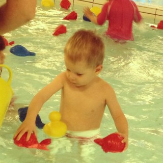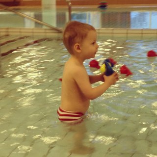 Ah, men så var det då dags, Lukas har idag gått på sin första ”sim” lektion – minisim 1. Det var han och en liten tjej som var minst på sina 2½ år, de andra såg ganska mycket större ut. Vi trodde att han skulle springa rakt ut i vattnet, men just idag kände han sig tydligen lite mammig/pappig, för det tog ett par minuter att övertala honom att det var ok att bada fast inte vi var med i vattnet… Men sen blev det full fart minsann, fast det var ju inte så där värst intressant att lyssna på vad fröken sa direkt, det var ju mycket roligare att göra precis vad man själv ville.
