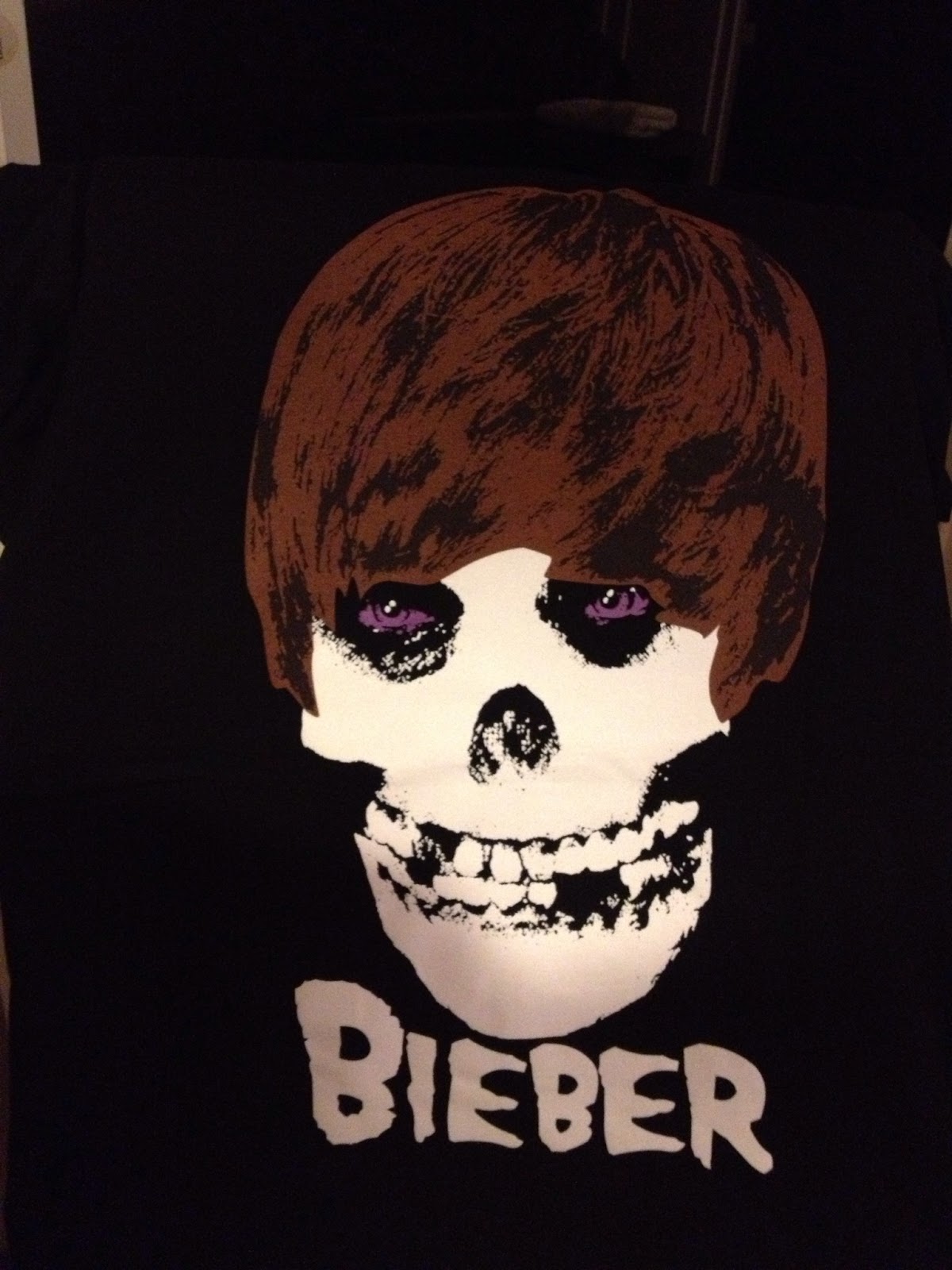 Han fick en t-shirt med förresten, tänkt att ha på sig när han går dit, men han är lite osäker på budskapet på tröjan… MIN tolkning är att man INTE gillar Bieber, men han tror att det är tvärtom (och han är INTE ett Bieber-fan) – hur tolkar NI bilden?