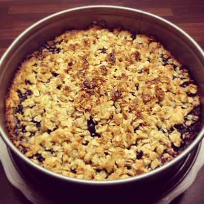 Blanda ner 150 g smält smör. Tryck ut degen (med en sked, den blir ganska kladdig) i en smord form, gärna med löstagbara kanter. Fyll på med blåbär, eller det bäret du vill egentligen. Jag tog ca 2 påsar frysta blåbär – är man känslig för att det blir lite ”blött” så kan man blanda i lite potatismjöl i bären.