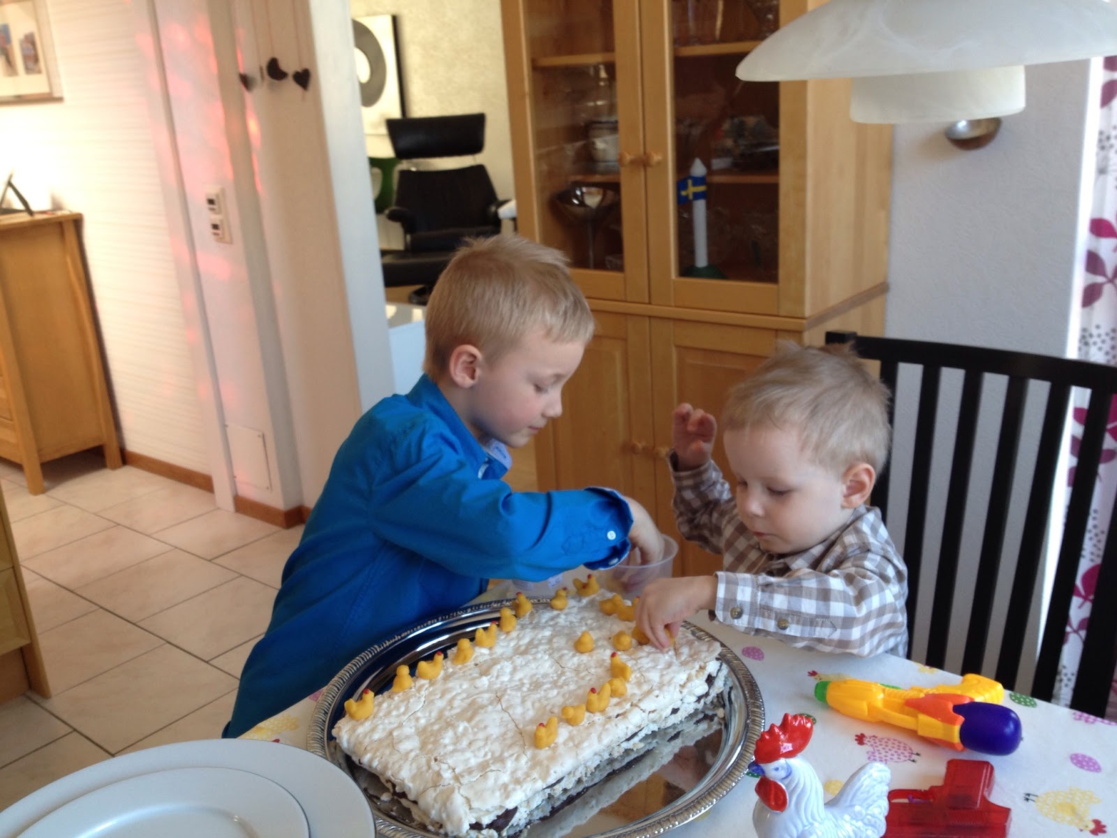 | Oliver och Lukas fick dekorera påsktårtan med kycklingar och tuppar. |