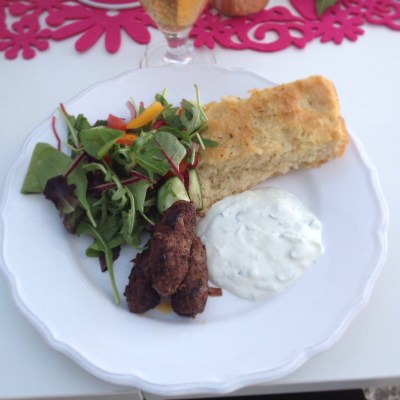 | På påskdagen blev det vardagslyx här hemma med Cevapcici (lammfärsspett), Tzatsiki och makens (!) nybakta focaccia. Sanslöst gott! |