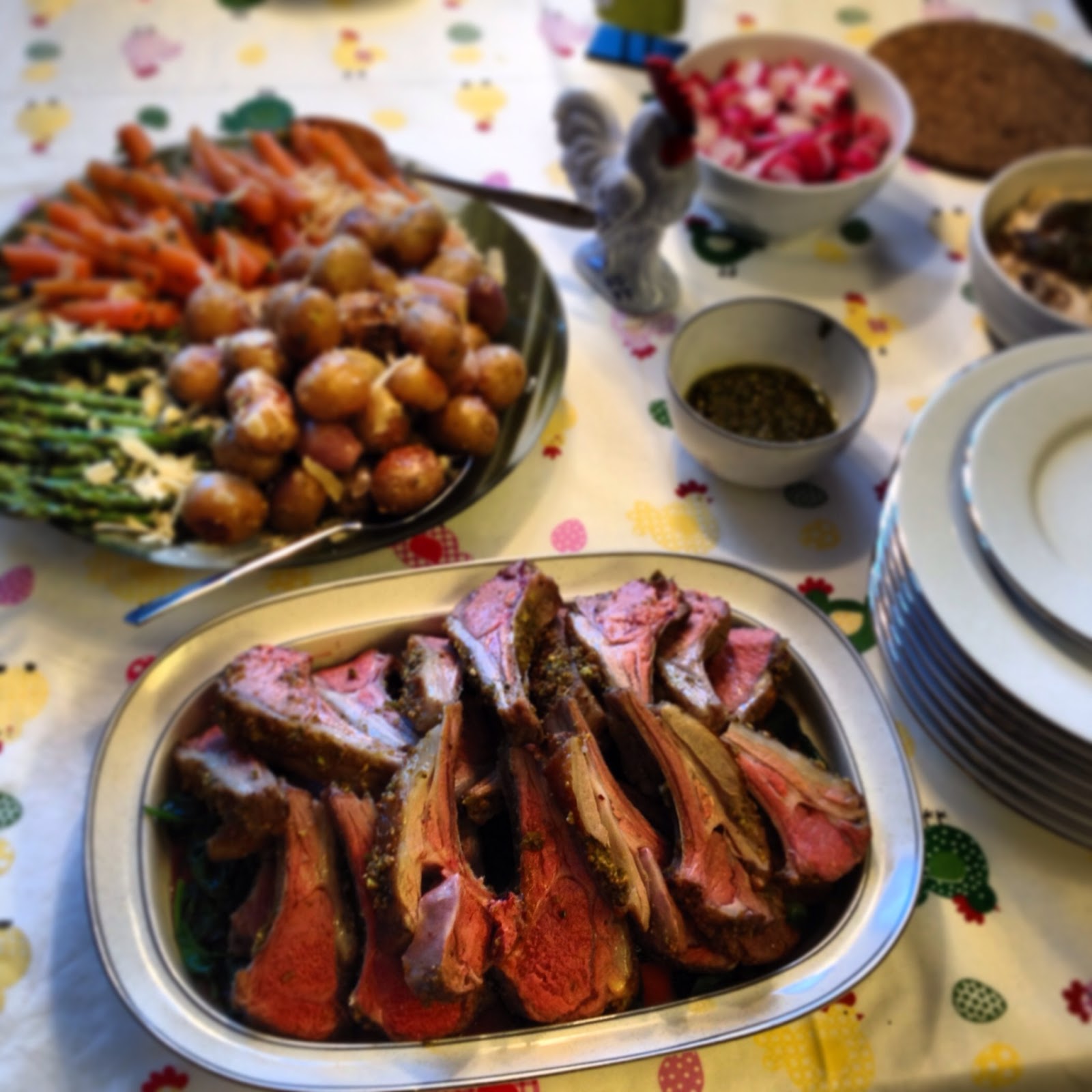 | Hemma hos mamma fick vi helt fantastiska lammracks, med en pistage- och citronkryddad primörsallad till. Grymt gott! |