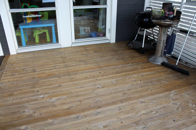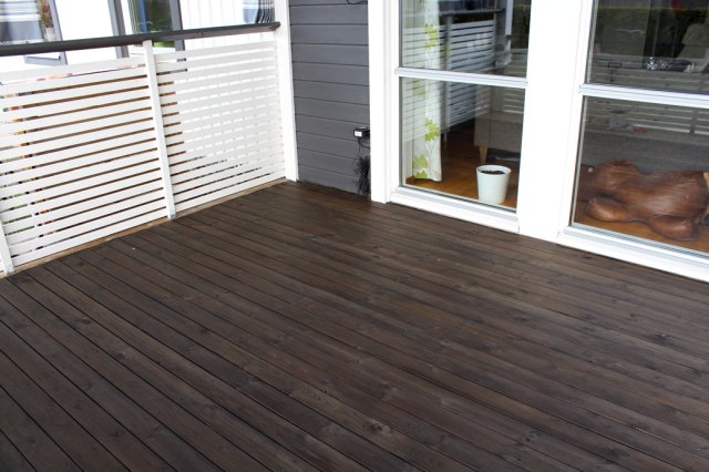 | Nymålat och fortfarande lite blankt, men när det torkat blir det sidenmatt och grå/brunt. Det ser väldigt mycket bättre ut än det vanliga trägolvet! |