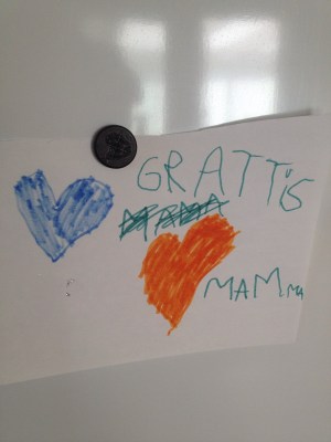 Självklart fick jag ett fint egenkomponerat grattiskort av Oliver! (och en go’ grattis-puss av Lukas)