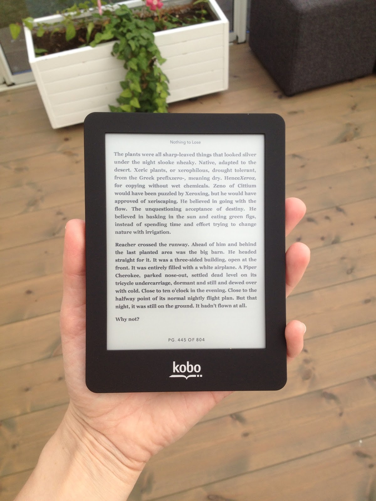 Paket av mina föräldrar och min bror fick jag ju i lördags, så i går var det makens tur. Fick en smidig liten läsplatta – perfekt när man vill sitta och läsa i solen! Vår lilla surfplatta har använts mycket för läsning nu i vinter annars, men så fort det är utomhus så går den inte att se ordentligt på. Läste meddetsamma en Jack Reacher-bok på den i solen!