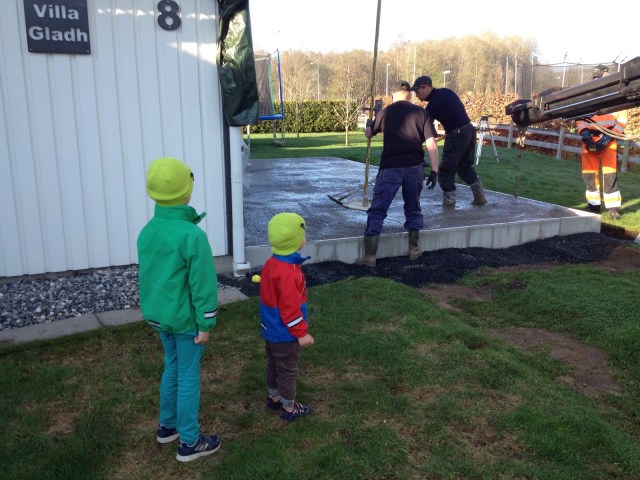 | Så här såg det ut i morse innan vi åkte till jobbet – de var på plats kl 7.00 och började fylla på med betong – till barnens (och vårt) stora nöje! |