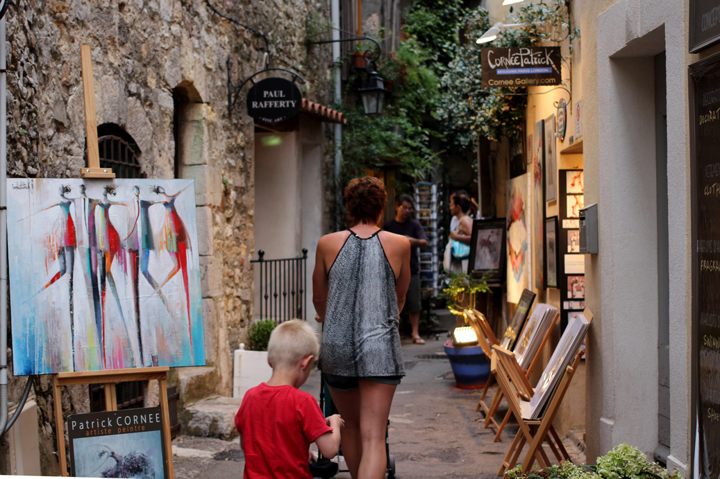 Här kommer några bilder från när vi var uppe i gamla stan i Mougins. Jag tror Picasso var där och målade en del eller nåt, mycket bilder på honom, men hela den gamla stadsdelen var nu full av konsthandlare och lite udda affärer, samt en del mysiga restauranger. Små, smala gator, såklart utan biltrafik!