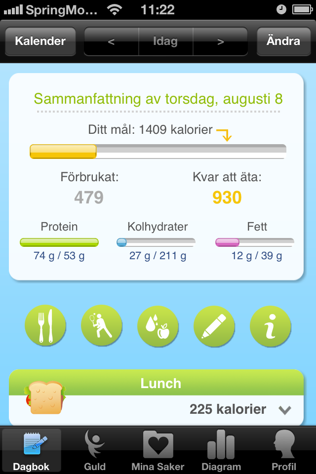 En annan bra app om man vill kolla tex kalorier, eller hur mycket protein och kolhydrater man får i sig på en dag, är ShapeUp. Här kan man skriva in all sin kost om man vill, jag brukar mest använda den när jag vill styra kosten i en viss riktning (som tex när jag fastade) eller om man vill kolla av protein och kolhydrater i olika saker. Har hittills inte hittat något livsmedel som saknas här, det finns vansinnigt mycket produkter!