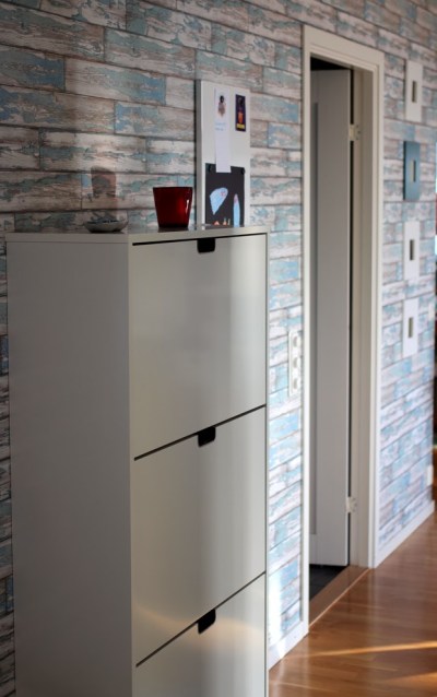 | Halltapeten fick faktiskt fortsätta ända ut i vardagsrummet. En ny sko-byrå från IKEA blev det med, oerhört bra möbel! |