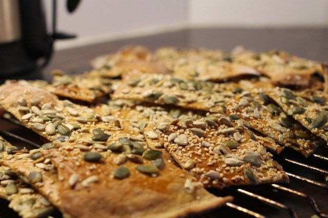 Låt jäsa övertäckt i en timme. Dela sedan degen i 4 delar, varje del ska kavlas ut så tunt att det täcker en hel plåt. Antingen kan man köra dem naturella, eller så kan man pensla med ägg och strö på tex sesamfrön och pumpafrön – jag gjorde även en plåt med lite cayennepeppar på, det blev också väldigt gott! Det är lättare att dela knäckebröden om man skär lite i degen när den ligger på plåten, innan man gräddar den.