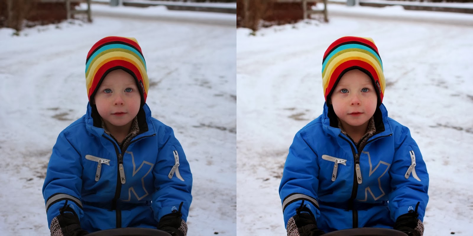 Slängde ju upp lite bilder i går utan någon redigering alls – oftast behövs ingen alls med den nya kameran, men skymning och snö i kombination gjorde ju bilderna lite mörka. Tänkte bara visa vilken skillnad man kan göra, på ungefär 30 sekunder. Klart man kan förbättra och justera dem bra mycket mer än så, men det är tid jag tyvärr inte har.