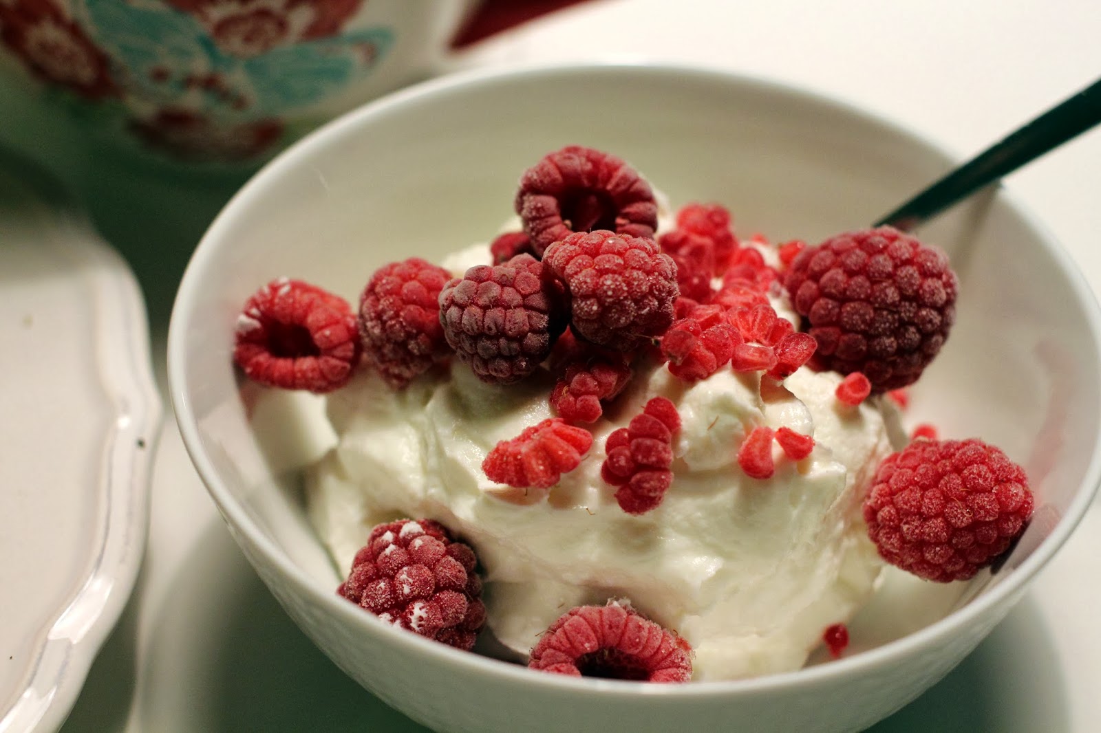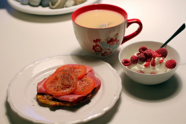 | Kvällens efterlängtade kvällsmat – ekologiskt Roiboste (min favorit från ICA – mangostan youghurt), en LCHF macka och en skål kvarg och hallon. Gott! |