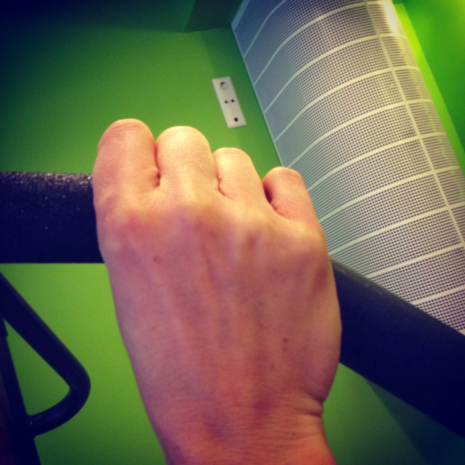 | Såret syns inte, det sitter på mittleden på långfingret, men som ni ser kan jag i alla fall böja fingret nu! |