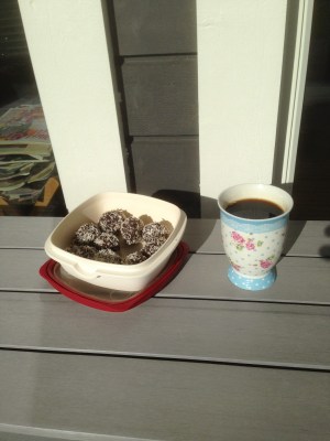 Det har ju i alla fall varit gott väder, och förutom att det blev lite kaffe och chokladbollar i solen, så kunde vi äta en god middag i ett solvarmt uterum i går kväll.