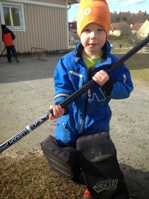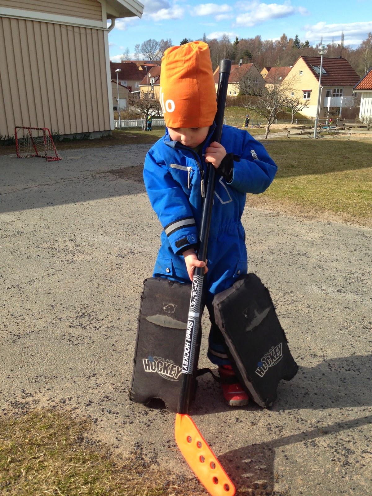Nu när det är lite mer vår i luften ser man att det plockas fram bandyklubbor och bollar på skola och dagis. Häromdagen när jag skulle hämta Lukas var det precis hans tur att få låna ”målvaktsskydden” på knäna, så det var klart han skulle få spela med dem lite. Snacka om att han var stolt! (han har dessutom bättre bollkänsla än mig…)