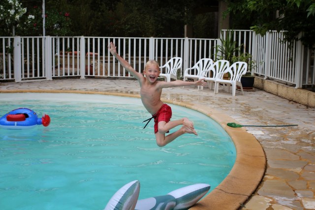 Lördagen spenderades på A9 söderut, vilken skittråkig väg det var… Platt och ointressant landskap, jag är van att komma ner mot alperna när man närmar sig rivieran, att köra genom Frankrike var ju inte alls lika roligt. Runt Lyon var det dessutom helt sinnessjukt mycket köer ( i båda riktningarna), så det här vägen tar vi nog inte igen – inte upp till Paris heller, som vi hade tänkt. Vid 16-tiden kom vi fram till huset i alla fall, väldigt skönt efter tre dagars bilåkande! Jättefint och stort, med fin pool, och 4 separata sovrum – perfekt eftersom vi mötte upp med mina föräldrar och även min bror senare på kvällen (han kom med flyget direkt ner). Min mamma fyller 60 i år, så hon bjöd hela familjen på boendet i det här stora huset – oerhört lyxigt! Barnen slängde sig såklart genast i poolen, och vi gjorde oss hemmastadda.