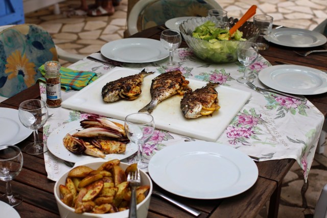 Vi blev så inspirerade av all fisk att det fick bli fisk till middag med – grillad medelhavsfisk (vars namn jag absolut inte kommer ihåg, men den var grymt god!).