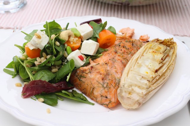 Grillad, snabbgravad lax, med grillad endive och en matig sallad