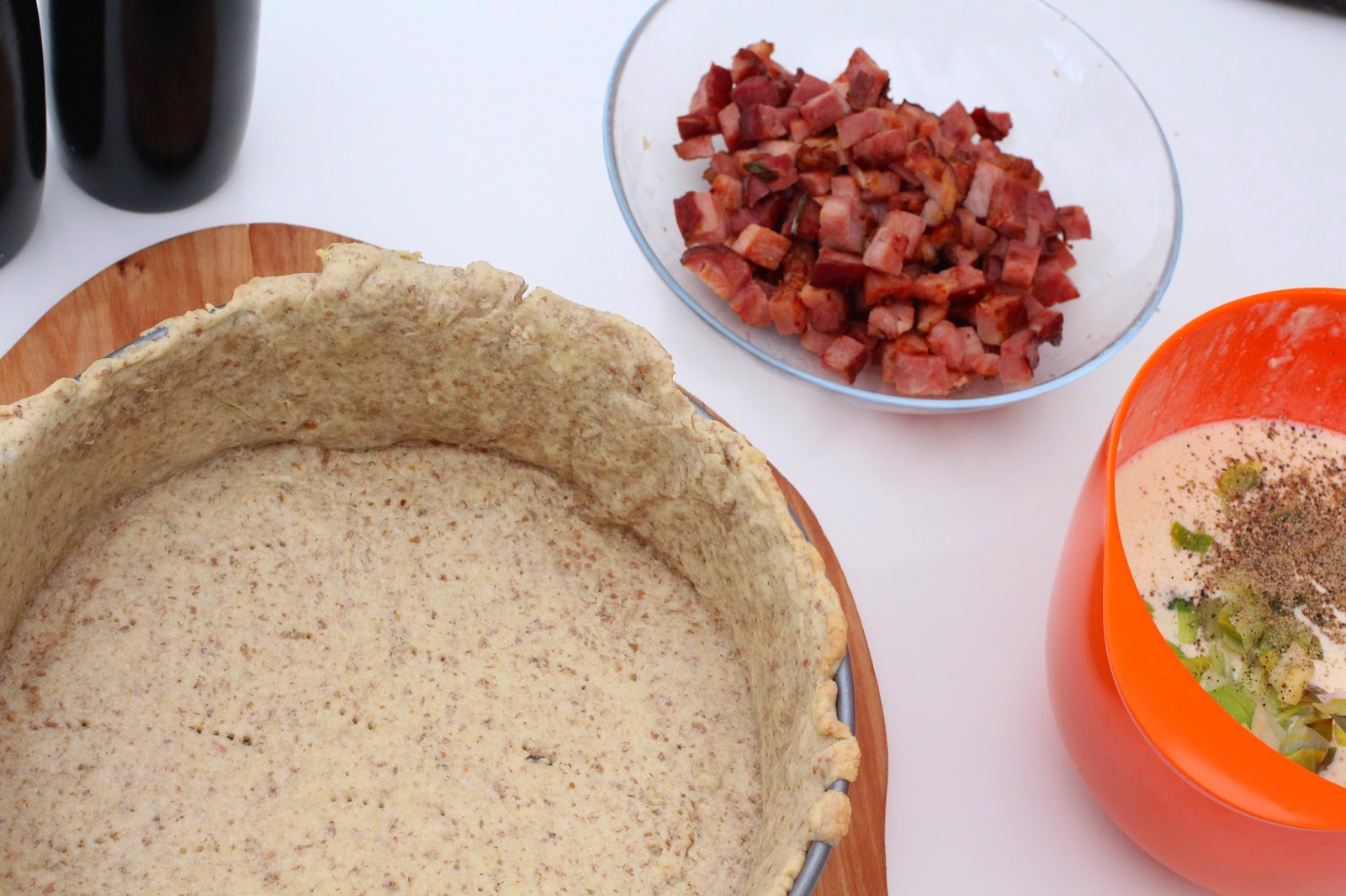 Mixa i matberedare tills det nätt och jämt blir en deg. Plasta in och lägg att vila i kylen, minst en halvtimme men gärna längre. Kavla eller tryck ut degen i en form, tryck fast kanterna med lite ugnsfolie och förgrädda pajskalen i ca 10-15 minuter (man kan ta bort folien efter ca 10 minuter och grädda det sista utan folie).