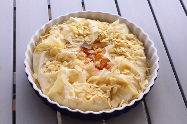 Vik över filodegskanterna, pensla på lite mer smör och strö över mandelflarn över de nedvikta kanterna. Ringla ev. lite honung över mandeln.