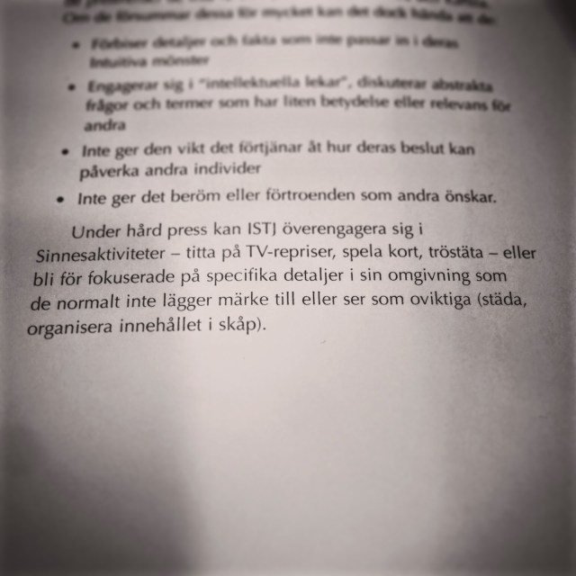 Vi fick även göra ett personlighetstest, Briggs Meyers, och jag tror jag nämnt tidigare att jag tycker det är vansinnigt kul. Det är alltid fascinerande när någon kan läsa av hela ens beteende med hjälp av några frågor – och min bokstavskombination blev då (inte ADHD) utan INTJ. Det säger nog inte direkt någon så mycket, men jag hade bland annat väldigt roligt åt hur min profil hanterar stress: