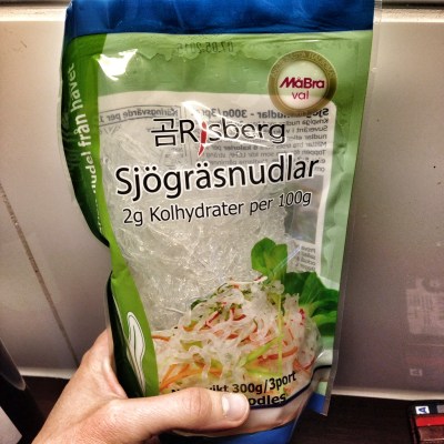 Nudlarna är i princip både kolhydratfria och kalorifria. I kall form var de liksom krispiga (och smakar absolut ingenting om de inte smaksätts), men i min wok betedde de sig som vanliga ris- eller glasnudlar och blev mjuka. De sög dessutom åt sig av smaken i såsen, så det överträffade STORT mina förväntningar på den här konstiga produkten!