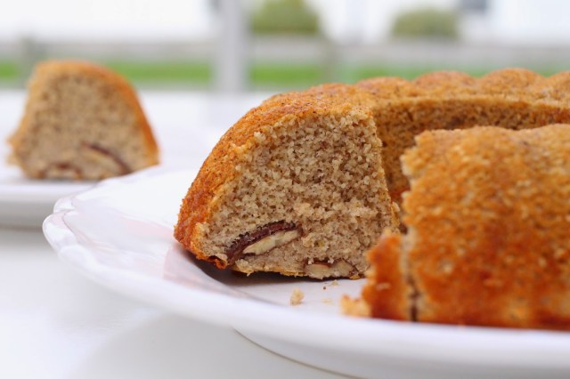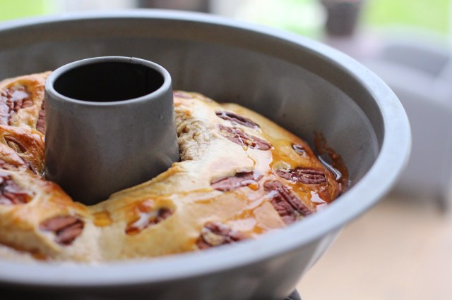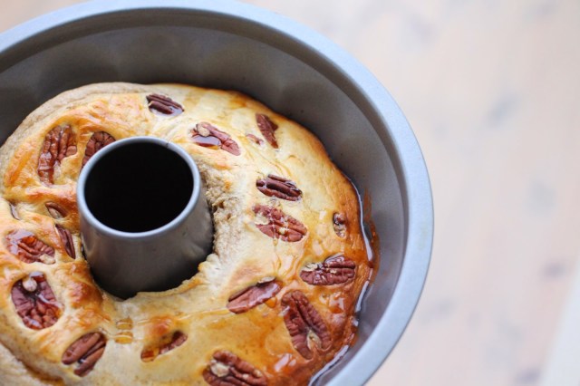 Mixa ihop allt med en stavmixer tills havregrynen är mixade, och häll i en rund hålform som är smord med kokosolja (eller smör, för den delen). Strö över lite pecannötter, om du känner för det =) Grädda mitt i ugnen på 175 grader i ca 20-25 minuter – den ska INTE vara helt torr i mitten utan ganska kladdig när du tar ut den.