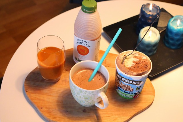 | Morotsjuice, varm chokladproteinmjölk och såklart, lite glass =) |
