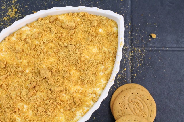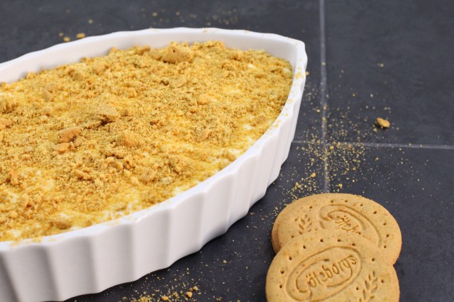 Smula 3-4 digestivekex (uttalas som av mamma, där man uttalar ALLA bokstäverna) i en form, och häll glassmeten över (om du har en glassmaskin så kan du köra smeten där i, såklart). Avsluta med ytterligare ett lager smulor, och ställ sedan i frysen ca 4 timmar, om du kan hålla dig….