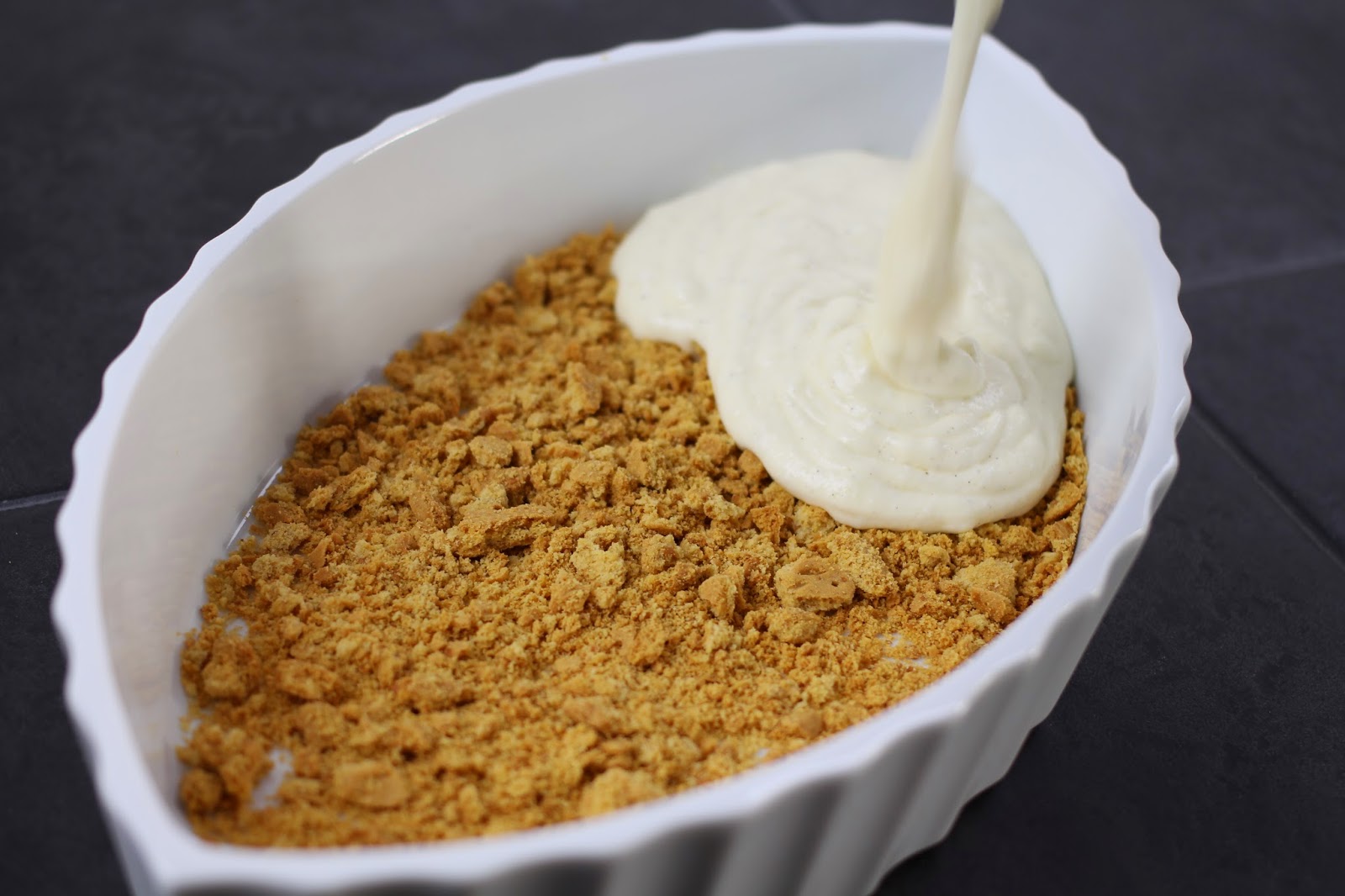 Smula 3-4 digestivekex (uttalas som av mamma, där man uttalar ALLA bokstäverna) i en form, och häll glassmeten över (om du har en glassmaskin så kan du köra smeten där i, såklart). Avsluta med ytterligare ett lager smulor, och ställ sedan i frysen ca 4 timmar, om du kan hålla dig….
