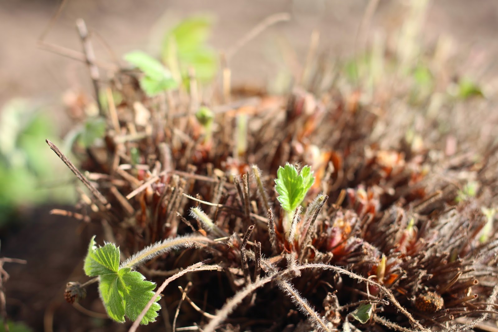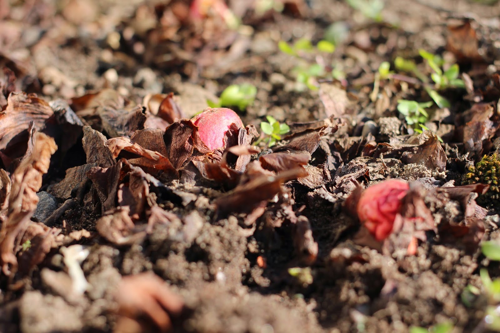 | I trädgården är det fullt med vårtecken redan – här är rabarberknoppar som tittar upp i landet i söderläge. |
