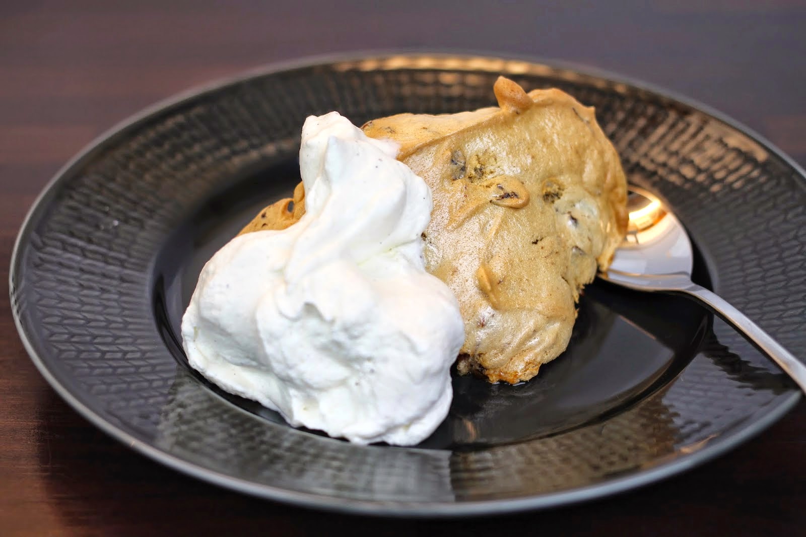 När sufflén är färdig ska den ätas direkt, annars sjunker den sakta ihop lite (men inte så himlans mycket om jag ska vara ärlig), med lite lättvispad grädde till. Så. Jäkla. Gott!!!