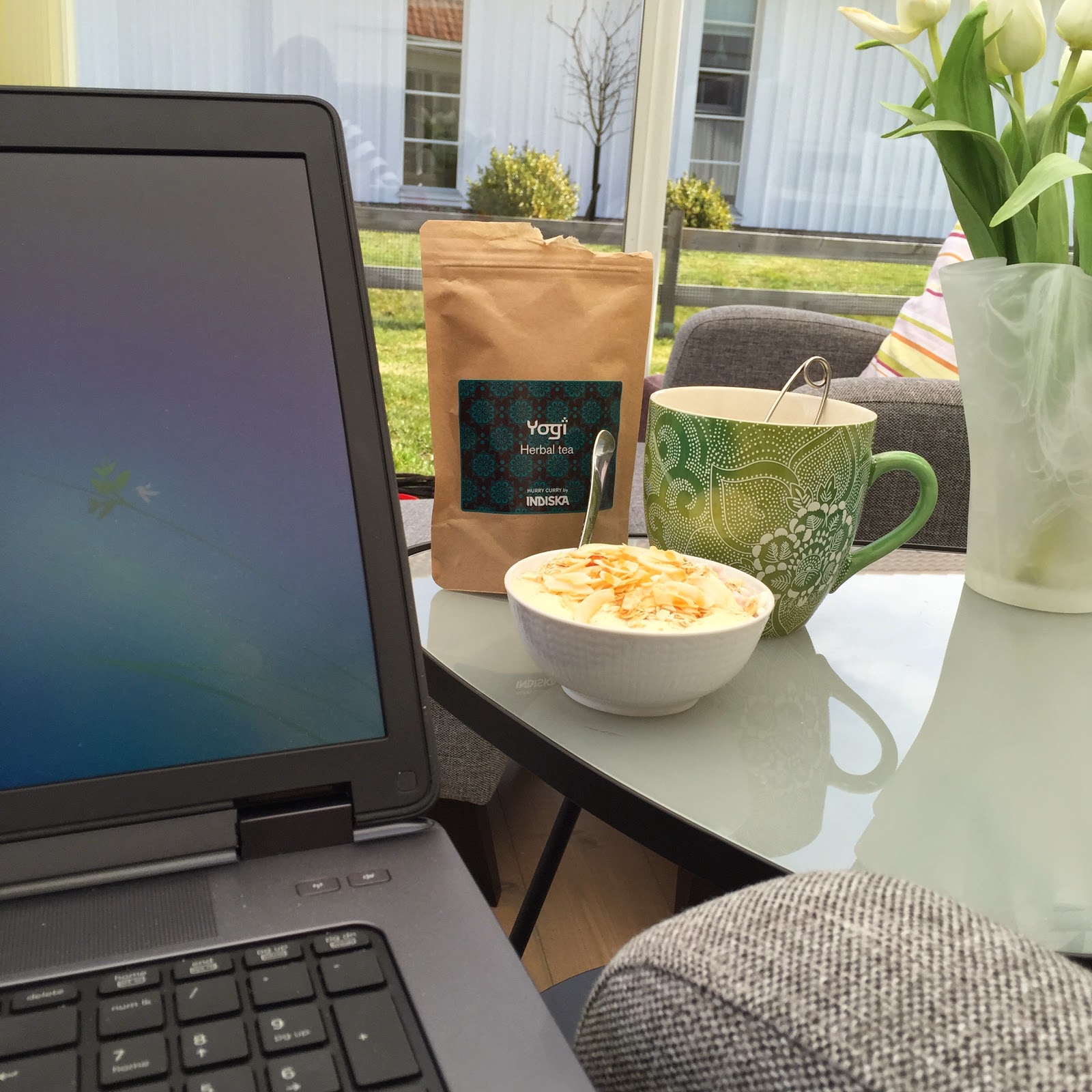 Min nya fina GIGANTISKA tekopp från indiska, med mitt nyfunna favoritte Yogi (det är egentligen inte alls ett te, utan bara en massa kryddor som ingefära, kanel och svartpeppar, det smakar ungefär som chai-te) och en skål med keso, kvarg, havregryn och kokosflingor.