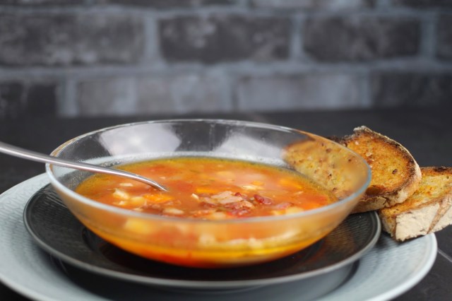 Servera med lite grillat surdegsbröd med olivolja och vitlök.