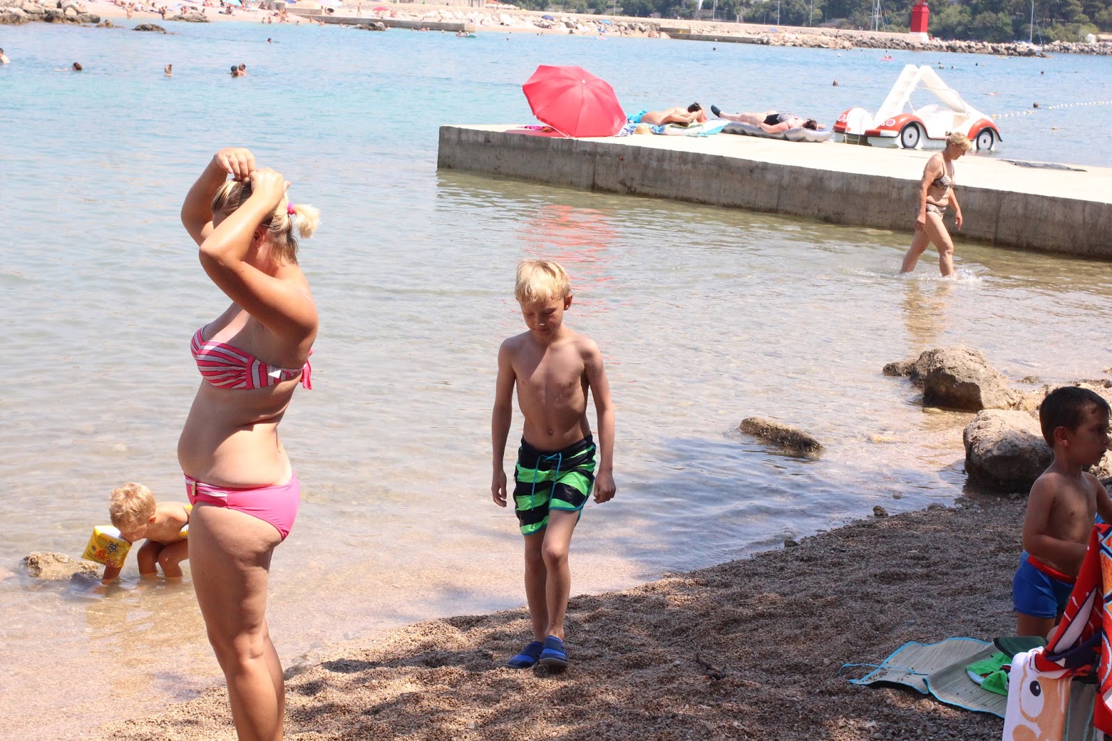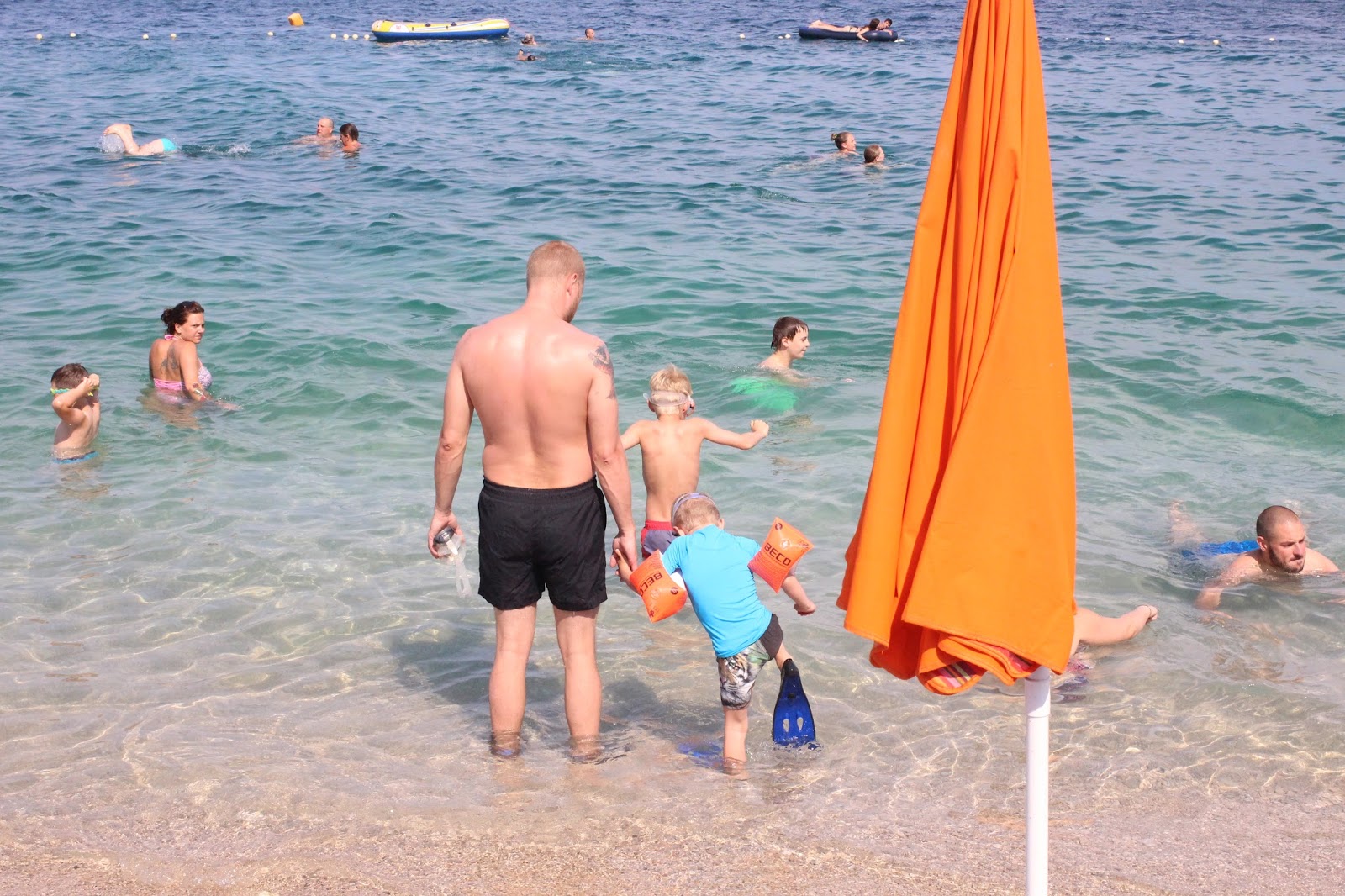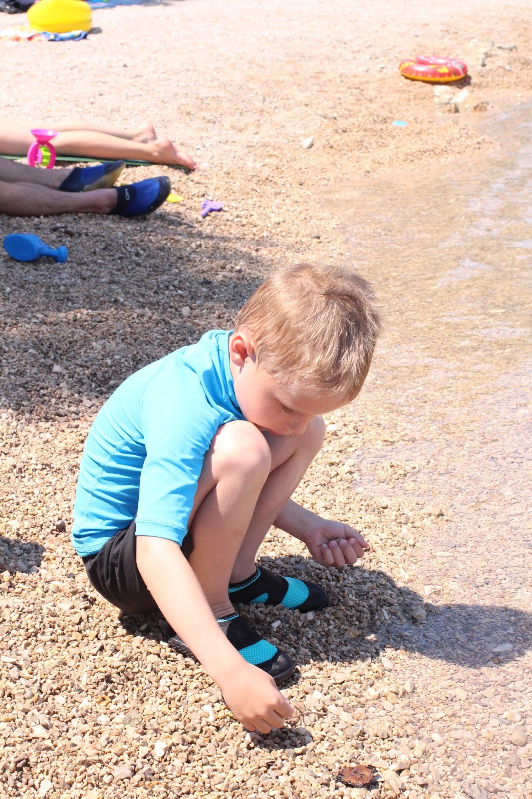 Havet – Kroatien (där VI var) är inte perfekt om man har väldigt små barn, jag tänker 1-3 år nånting. Dels är det stenstränder med varierande storlek på stenen, från stort ”grus” till stora sjöstenar – och vidare till klippor och gjutna cement”stränder”. Stenarna är mjuka och runda, men dels blir de väldigt varma och dels är det lite svårt att gå på dem – om man inte har ett par bra badskor, vilket för övrigt är ett absolut måste om man vill kunna bada ”precis som vanligt” och vill slippa balansera sig ner i vattnet. Det finns ganska gott om sjöborrar, men mina reflektioner är att där det är en strand, där har man rensat åtminstone den inre delen av sjöborrar, alltså är det ingen direkt fara för tex barnen att gå ner i vattnet för sjöborrarna kommer inte förrän efter barnen inte bottnar.