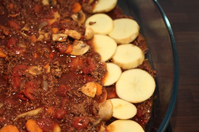Koka ihop köttfärssåsen om du inte använder rester. Lägg ett tunt lager i botten på en ugnsfast form. Skär potatisen i halvtjocka skivor (ca 0,5 cm) och lägg ett lager över köttfärssåsen, innan du täcker det med ytterligare köttfärssås. Upprepa en gång till, så det blir 3 lager köttfärssås och 2 lager potatis.