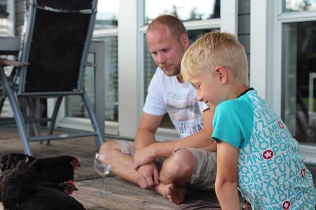 | Oliver har väldigt god hand med hönorna, och de låter honom oftast klappa lite på dem. |