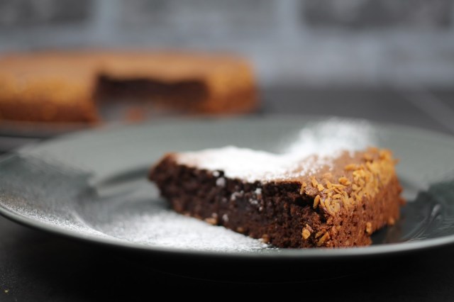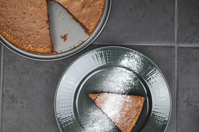 Bröa en springform med smör eller kokosolja samt kokosflingor. Smält smöret och låt det svalna lite. Vispa ägg och socker fluffigt, vispa sedan ner sirapen. Tillsätt det avsvalnade smöret och sikta ner mjöl, kakao, vaniljpulver och salt. Grädda i nedre delen av ugnen, på 150 grader, i ca 10-25 minuter (kan variera väldigt mycket), så den är klar längst ut i kanten men kladdig i mitten.